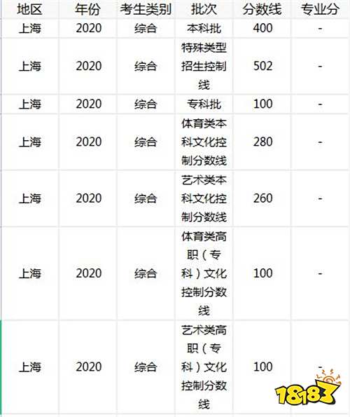 以下是2020年上海高考本科批、特殊类型招生控制线、专科批艺术类本科文化控制分数线、体育类本科文化控制分数线、艺术类高职(专科)文化控制分数线、体育类高职(专科)文化控制分数线。