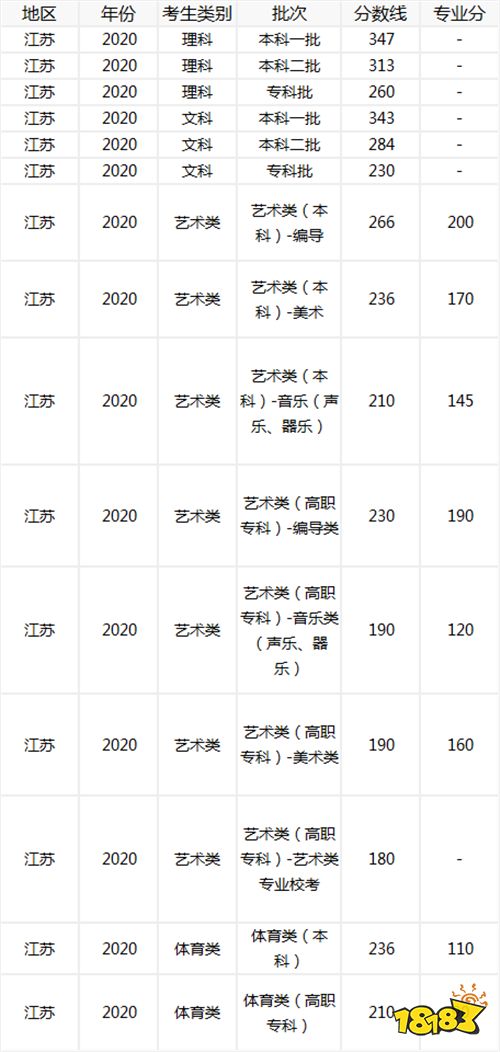 下面是2020年江苏高考本科一批、本科二批、专科批体育类(本科)、艺术类(本科)、艺术类(高职专科)和体育类(高职专科)的录取分数线。