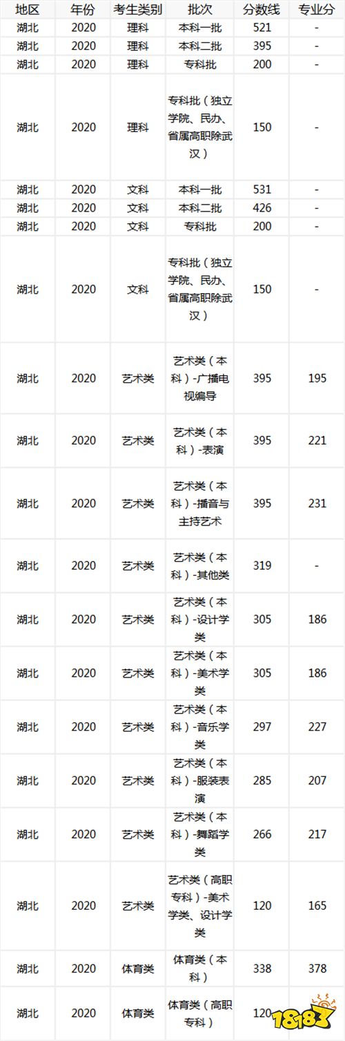 下面是2020年湖北省高考本科一批、本科二批、专科批、专科批(独立学院、民办、省属高职除武汉)、体育类(本科)、艺术类(本科)、艺术类(高职专科)和体育类(高职专科)的录取分数线。