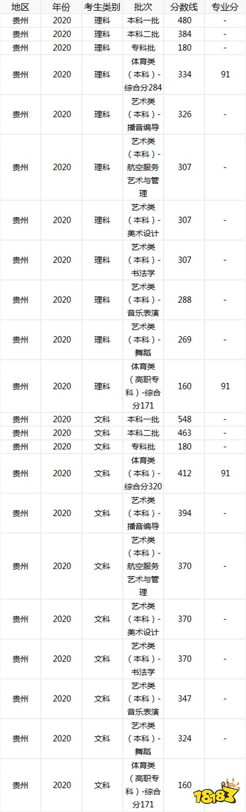 下面是贵州2020年本科一批、本科二批、专科批、体育类(本科)、艺术类(本科)和体育类(高职专科)高考录取分数线。