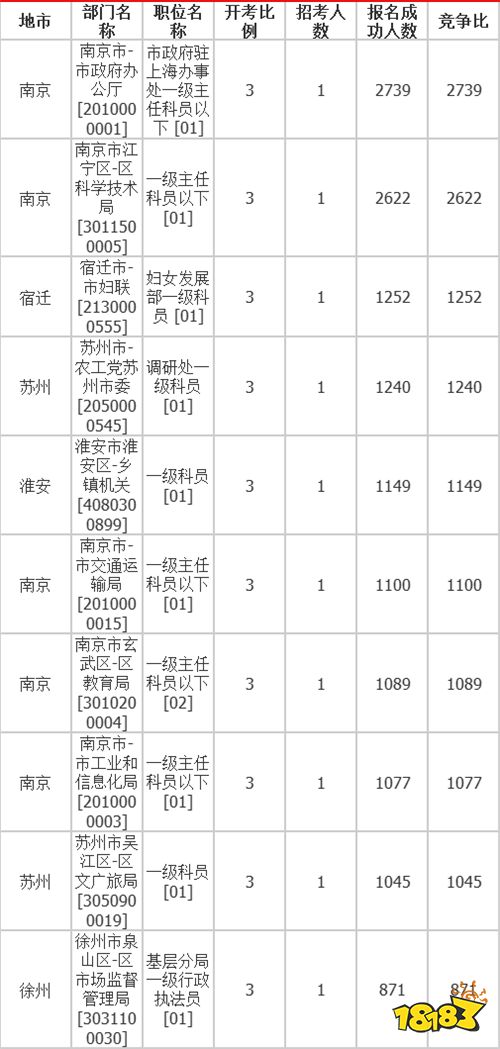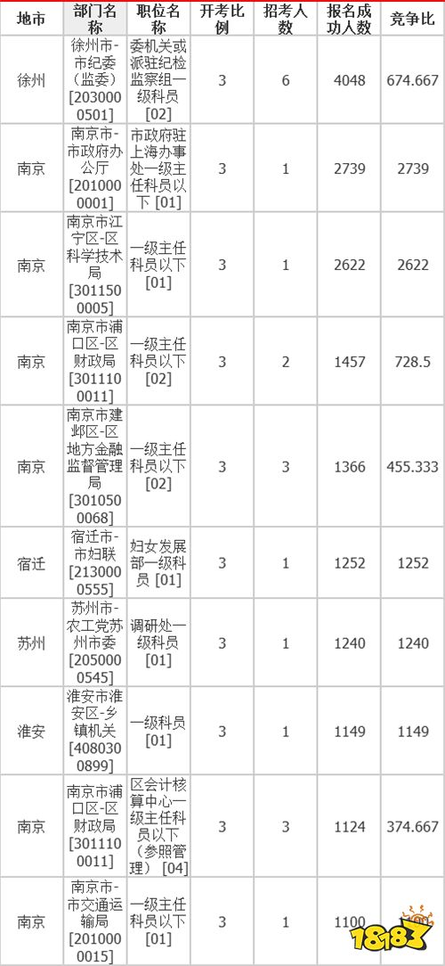 全省竞争最激烈的排名前三的职位:南京市-市政府办公厅—市政府驻上海办事处一级主任科员以下、南京市江宁区-区科学技术局—一级主任科员以下、宿迁市-市妇联—妇女发展部一级科员。竞争比第一的已经达到2739:1,同时我们可以发现今年的千里挑一的岗位不在少数,前9个岗位竞争比都在1000:1以上,竞争非常激烈。