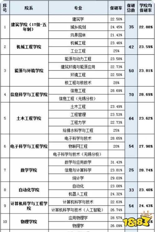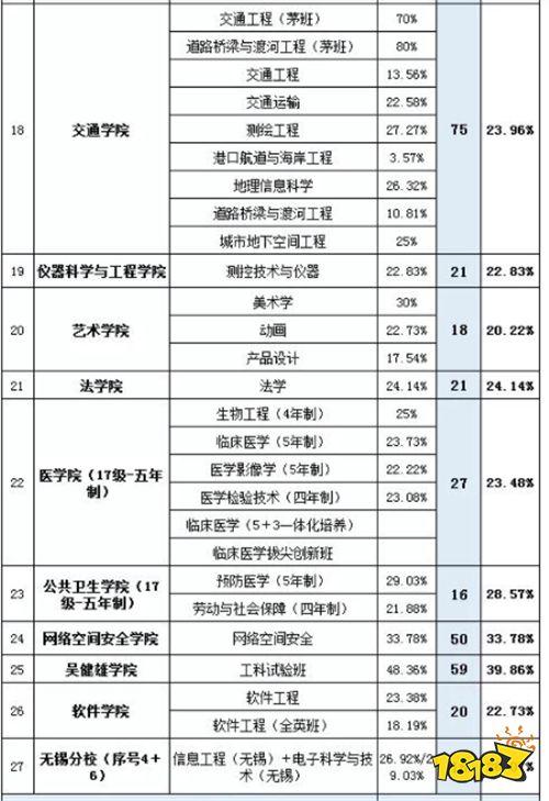 东南大学总部加无锡分校总共27个院系,79个专业+1个支教团!其中保研率最高的是交通学院的道路桥梁与渡河工程(茅班)80%,高达4/5的同学都保研了,其次是交通学院的交通工程(茅班)70%,保研率高的专业也是高校的最强专业,交通运输工程专业是东南大学的A+王牌专业!