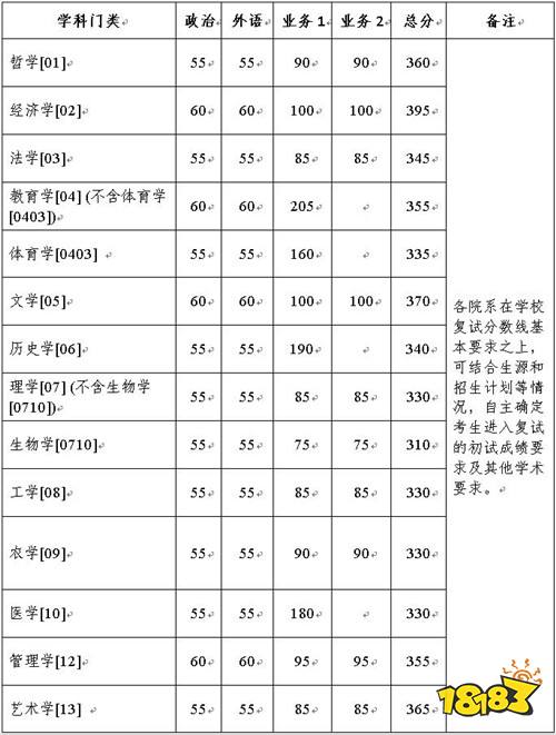 三、上述两表所列分数线(管理类联考除外)满足以下情况视同上线:若单科低1分,总分相应高20分及以上;单科低2分,总分高25分及以上;以此类推,单科每低1分,总分相应再提高5分。但单科不得低于基本要求5分以上,且仅限1门单科。适用该政策上线的考生,总分相应扣减后(扣减20分、25分,依次类推)计算各项排名。