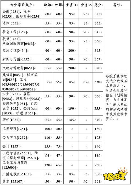 1.医学院公共卫生、护理专业类别考生,满分为100分的科目成绩不低于50分,满分为300分的科目成绩不低于150分,总分成绩不低于290分,可参加差额复试。