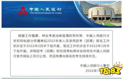 根据工作需要,综合考虑当前疫情防控形势,中国人民银行分支机构和部分所属单位2022年度人员录用招考(招聘)报名工作初步定于2022年2月中下旬开展,笔试工作初步定于2022年3月中下旬开展。详细招考(招聘)职位信息和具体安排将在中国人民银行官方网站上另行公告,欢迎有意向报名的考生持续关注。