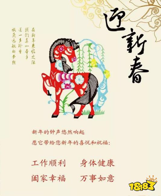 3、马蹄声声辞旧岁,举国同庆欢腾随。美酒佳肴尽醇香,红烛映福心飞扬。合家老少享团圆,笑语盈盈连成片。马年驾到心欢畅,愿友幸福乐逍遥。马年快乐。