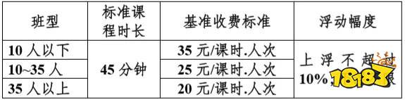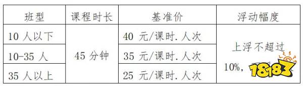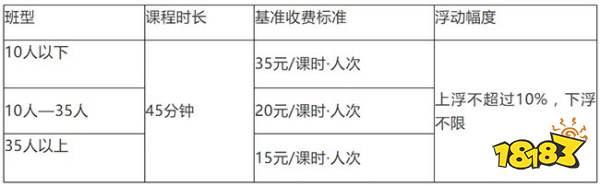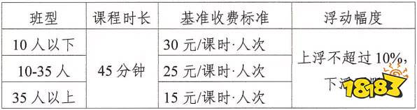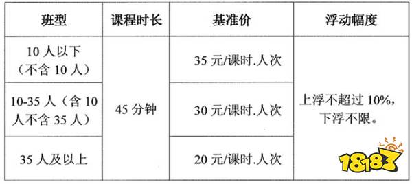 1-9人(含)班型38元/课时·人次;10-35人(含)班型25元/课时·人次;36人(含)及以上班型为15元/课时·人次。各培训机构在基准收费标准上可根据实际情况在浮动幅度(上浮不超过10%、下浮不限)内确定具体收费标准。每课时45分钟,实际时长不一样的,收费按比例折算。
