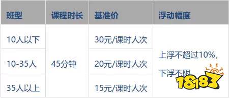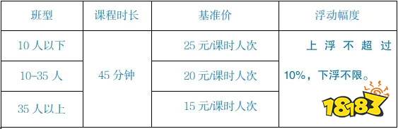 班型10人以下30元/课时·人,班型10-35人20/元课时·人,班型35人以上15/元课时·人。浮动幅度,上浮不得超过10%,下浮不限。线下标准课程时长为45分钟,实际时长不一样的,按比例折算。