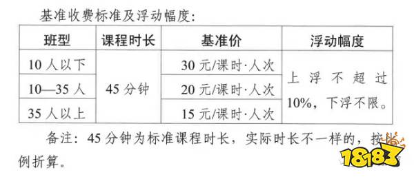 各培训机构可在基准收费标准和浮动幅度内,根据实际情况定具体收费标准,上浮不得超过10%,下浮不限。线下标准课程时长为45分钟,实际时长不一样的,按比例折算。